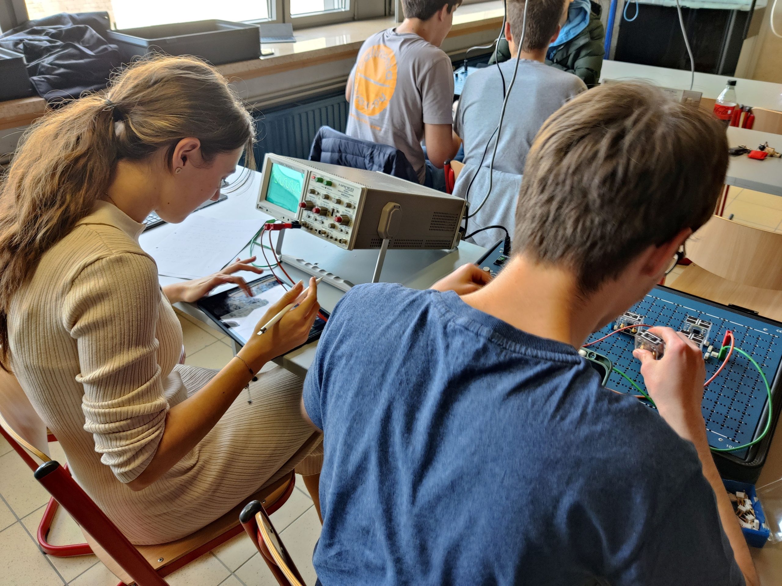 Déi lescht Woch hunn eis Schüler vun der 2GIG d’Lade- an d’Entladeverhalten vu Kondensatoren an engem Wiesselstroumkrees mat Hëllef vun engem Oszilloskop ënnersicht.