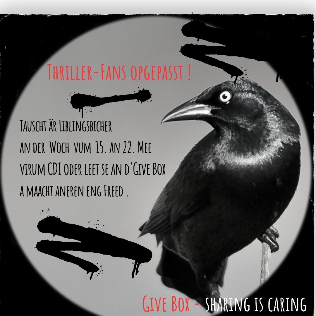 News vum Projet Give Box: Elo geet et ëm spannend Lektür! Wien neie Liesstoff brauch oder e puer vu senge Bicher ofgi wëll, kann dat méindes a freides tëschent 11:50 an 12:40 Auer an der Give Box virum CDI maachen.
