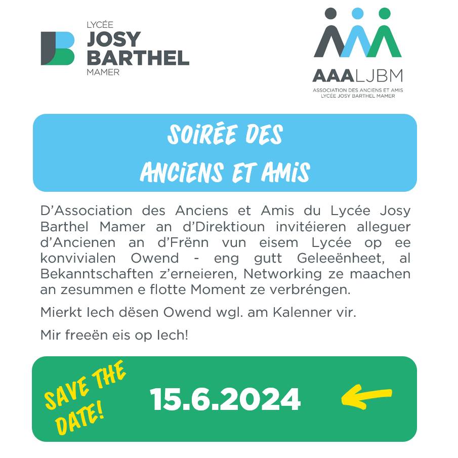 Hei dann nach déi versprachen Informatiounen zu eiser Soirée des Anciens et Amis. Mir ginn allen Ancienen a Frënn vum LJBM Rendez-vous e Samschdeg, de 15.6., ab 19:00 Auer an eisem Festsall. Am Kader vun engem Walking Dinner wäerte sech …