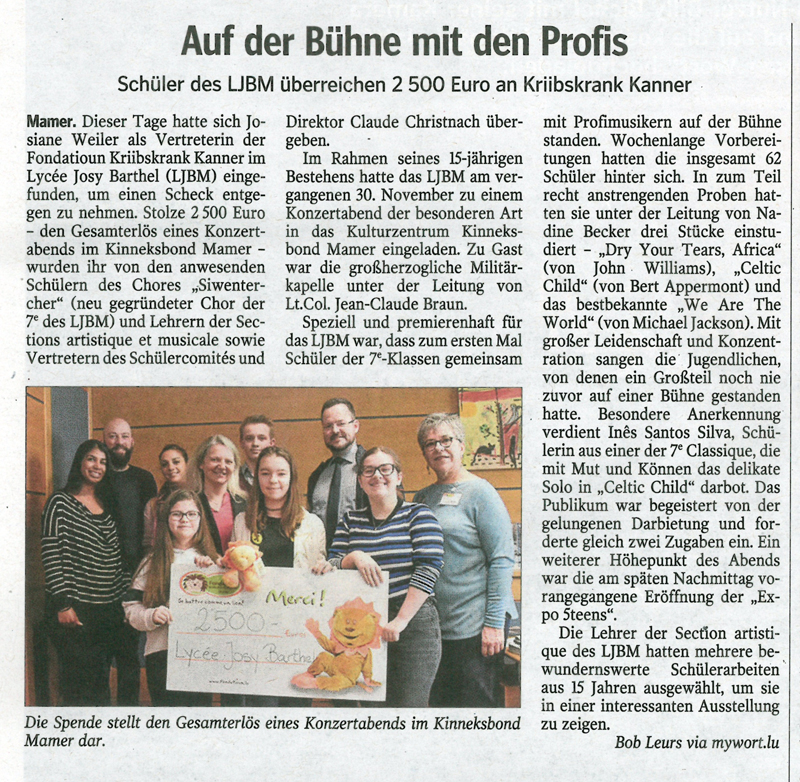 Article Luxemburger Wort du 26/03/2019 15 Joer LJBM, dat ass een Evenement, dat gefeiert gi muss, a bitt zudeem eng Geleeënheet, ee Bléck zeréck ze werfen. An deem Sënn si mir frou a stolz, Iech konnten den Owend vum 30. …