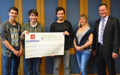 Un chèque de 1.650 euros a été remis à Monsieur Julien Pincemaille, F2F & Telemarketing Project Officer au Profit de l’association Médecins sans Frontières Luxembourg. C’est à l’occasion du “TALENTOWEND 2016” que Madame Nadine Becker, enseignante de musique, a pu …