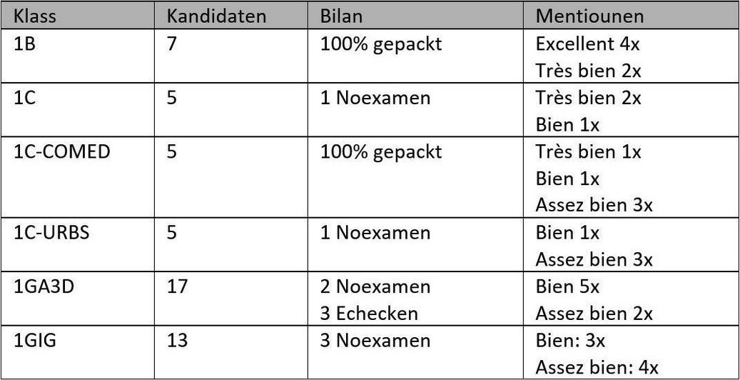 En Deel vun de Resultater ass schonn do, a mir zéien hei en 1. Bilan. Och dëst Joer hunn eis Schüler erëm ganz gutt an den Examen ofgeschnidden. Heifir e groussen Applaus! E Merci geet och un eis Enseignanten, déi …