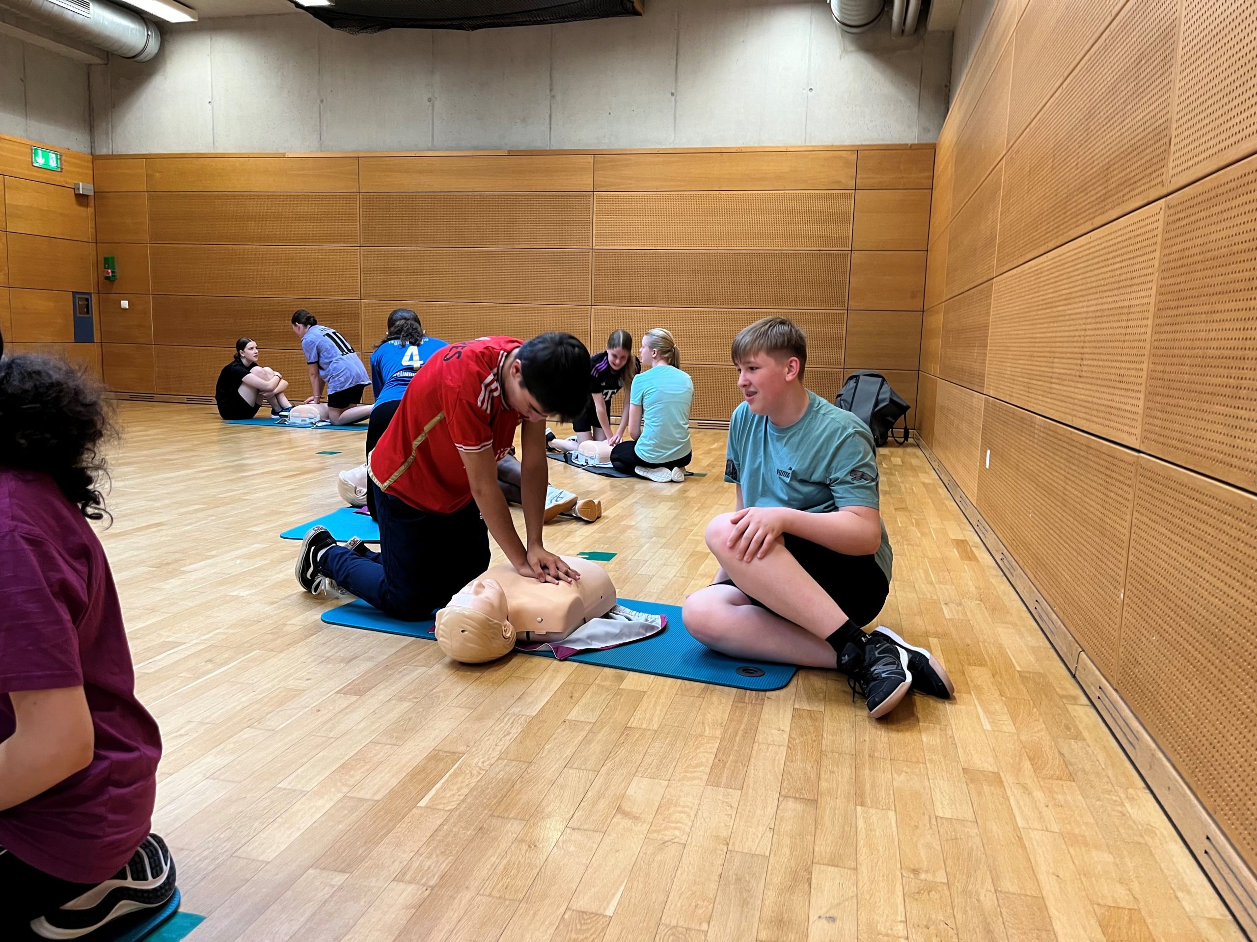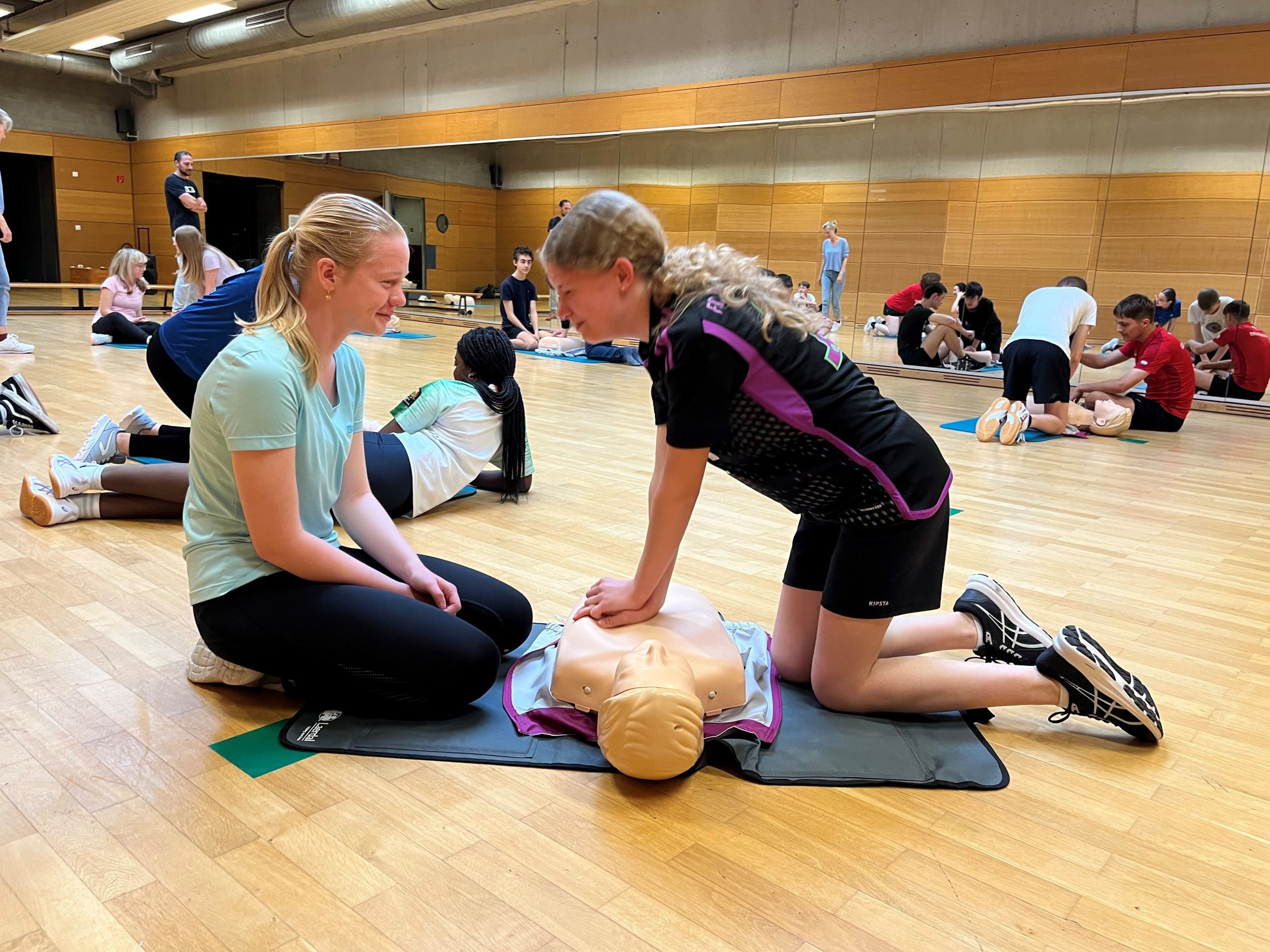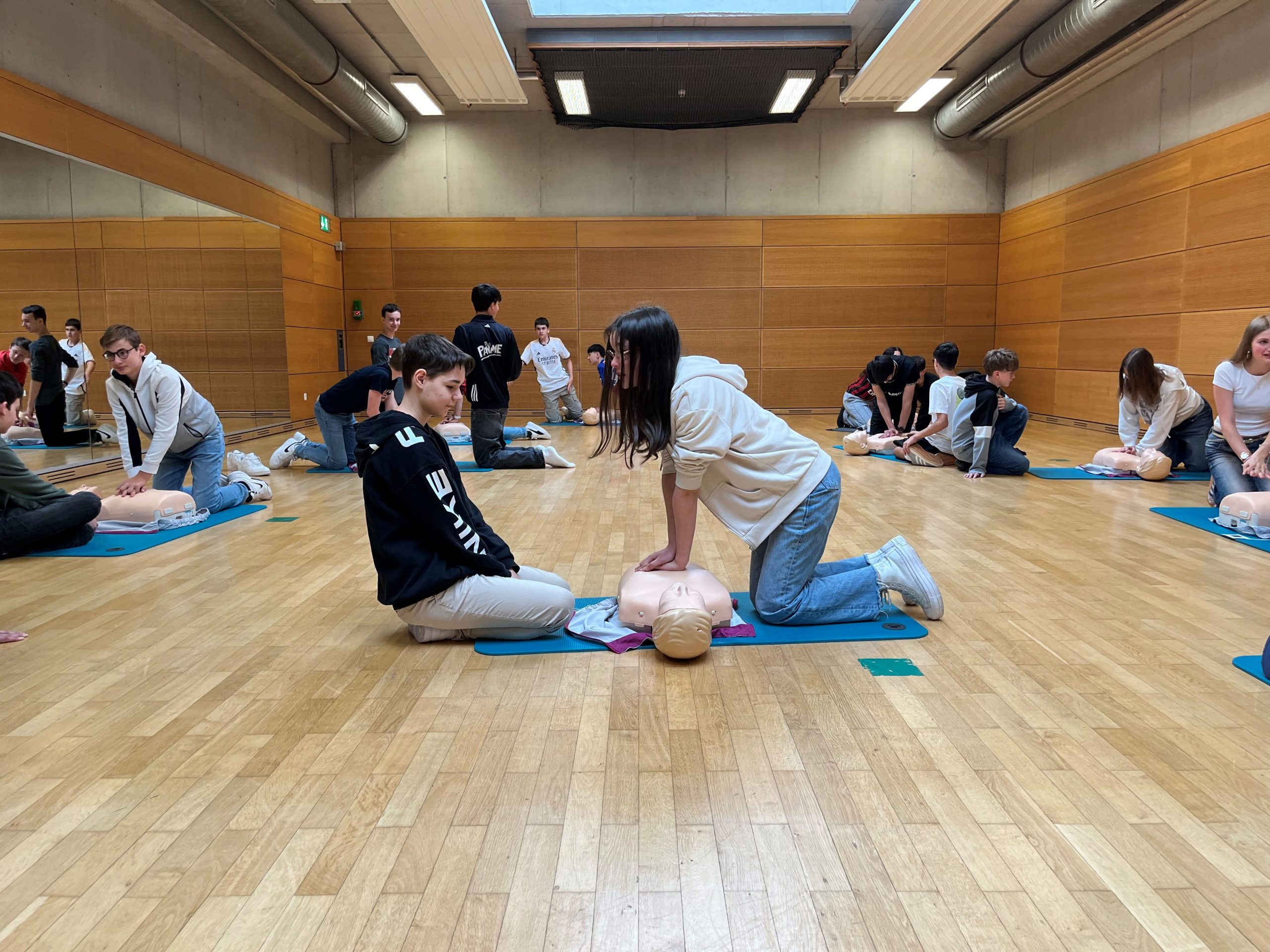No de Schüler vu 4e a vun 2e hunn déi lescht Wochen och eis 6e-Schüler am Kader vun der Campagne “Réagis” liewenswichtegt Wësse geléiert a praktesch ageüübt. Si hunn trainéiert een Häerzstëllstand z’erkennen, den 112 unzeruffen an eng Häerzmassage ze maachen. Mat dëse Basisschrëtter léieren eis Schüler am Eeschtfall op een Häerzstëllstand ze reagéieren an esou d’Zäit z’iwwerbrécken, bis de Samu antrëfft.
