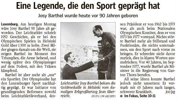 De 24. Abrëll wär de Josy Barthel, deen am Joer 1952 fir Lëtzebuerg Olympescht Gold am 1500-Meter-Laf gewonnen hat, 90 Joer al ginn. No där immenser sportlecher Leeschtung zu Helsinki huet de gebiertege Mamer als President vun der FLA an der COSL staark un der Moderniséierung an Ëmstrukturéierung vum Lëtzebuerger Sport bäigedroen an och als Member vum Ministère vill am Land beweegt. Een ausféierleche Bericht iwwer de Josy Barthel kann een hei liesen. Bob LEURS – 04/2017