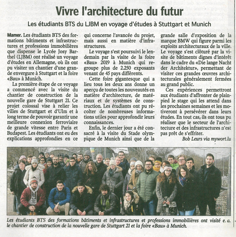 Les étudiants BTS des formations Bâtiments et infrastructures et Professions Immobilières que dispense le LJBM ont réalisé un voyage d’étude du 16 au 19 janvier où ils ont pu visiter un chantier d’une grande envergure et la Foire Bau à Münich.