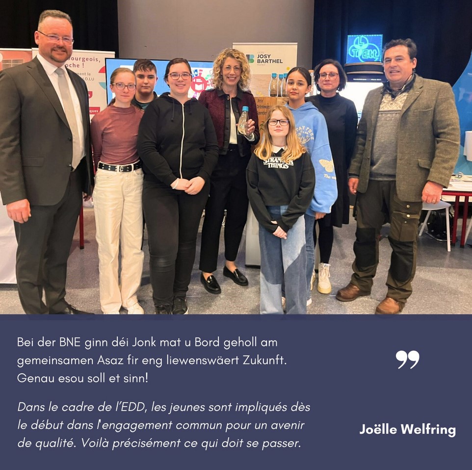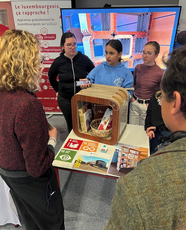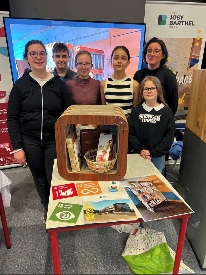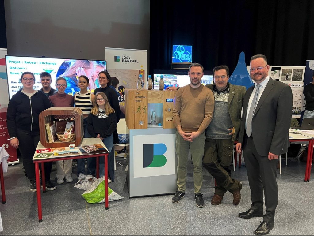 Den 20. Abrëll huet am Forum Geesseknäppchen d’Foire fir nohalteg Bildung BNE stattfonnt, wou de Lycée Josy Barthel Mamer ënner 70 Stänn och mat 2 flotte Projete vertruede war. D’nohalteg Bildung ass ee vun de Piliere vum Schoulentwécklungsprogramm vum LJBM. Souwuel d’Ëmweltministesch Mme Joëlle Welfring wéi och den Educatiounsminister Här Claude Meisch hunn den Explikatioune vun eise Schüler nogelauschtert, wéi et ëm de “Josy Waasserspender” gaangen ass, deen als Projet an eisem Makerspace gebaut ginn ass, souwéi dem Projet vun der “Give Box”, engem Regal, wat vu Schüler vun der Optioun „Save Our Planet“ a villen Aarbechtsstonnen aus recycléiertem Kartong zesummegebaut ginn ass. E grousse Merci un all déi engagéiert Schüler mat den Enseignantë fir hiren Asaz!