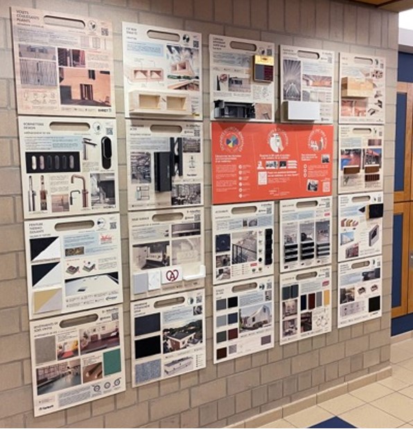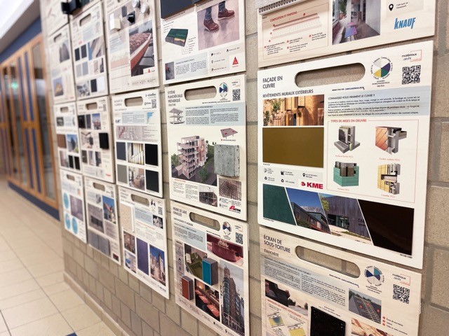 La Matériauthèque offre de nombreux outils pour faciliter la compréhension et l’apprentissage des matériaux. Les panneaux muraux interactifs, équipés de QR codes, permettent par exemple aux étudiants d’accéder directement à des informations supplémentaires. En outre, une importante base de données digitale, riche de plus de 4500 fabricants et 10000 produits, met en avant des matériaux traditionnels, biosourcés, innovants et éco-responsables.