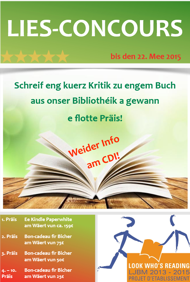Publié le 11/06/2015Am Kader vum Projet d’établissement “Look who’s reading” organiséiere mir an Zesummenaarbecht mat der Bibliothéik e Lies-Concours, wou et flott Präisser ze gewanne gëtt. Hei gëtt et weider Informatiounen: