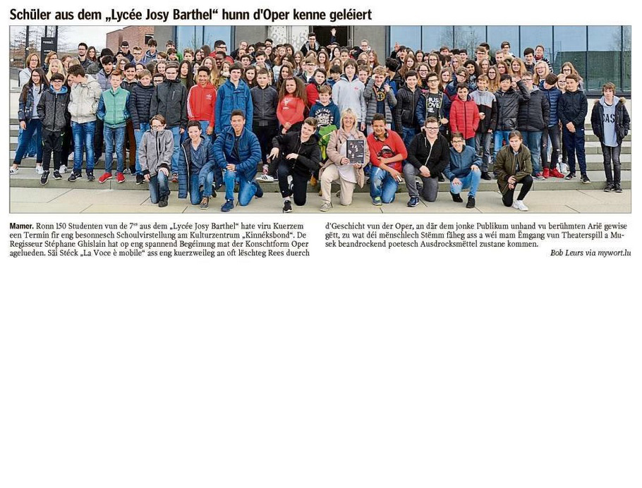 Publié le 02/07/2017De 17. Mäerz hate ronn 150 7ème-Schüler aus dem Lycée Josy Barthel een Termin fir eng besonnesch Schoulvirstellung am Mamer Kinnéksbond. De Regisseur Stéphane Ghislain hat op eng spannend Begéignung mat der Konschtform Oper agelueden. Säi Stéck La Voce è mobile ass eng kuerzweileg an oft lëschteg Rees duerch d’Geschicht vun der Oper, an där dem jonke Publikum unhand vu berühmten Arien gewise gëtt, zu wat déi mënschlech Stëmm fäheg ass a wéi mam Ëmgang vun Theaterspill a Musik beandrockend poetesch Ausdrocksmëttel zustan kommen. Ee Merci un d’Enseignanten Françoise Christnach an Nadine Becker, déi dee flotten Ausflug organiséiert haten. 03/2017 – LW du 25/042017