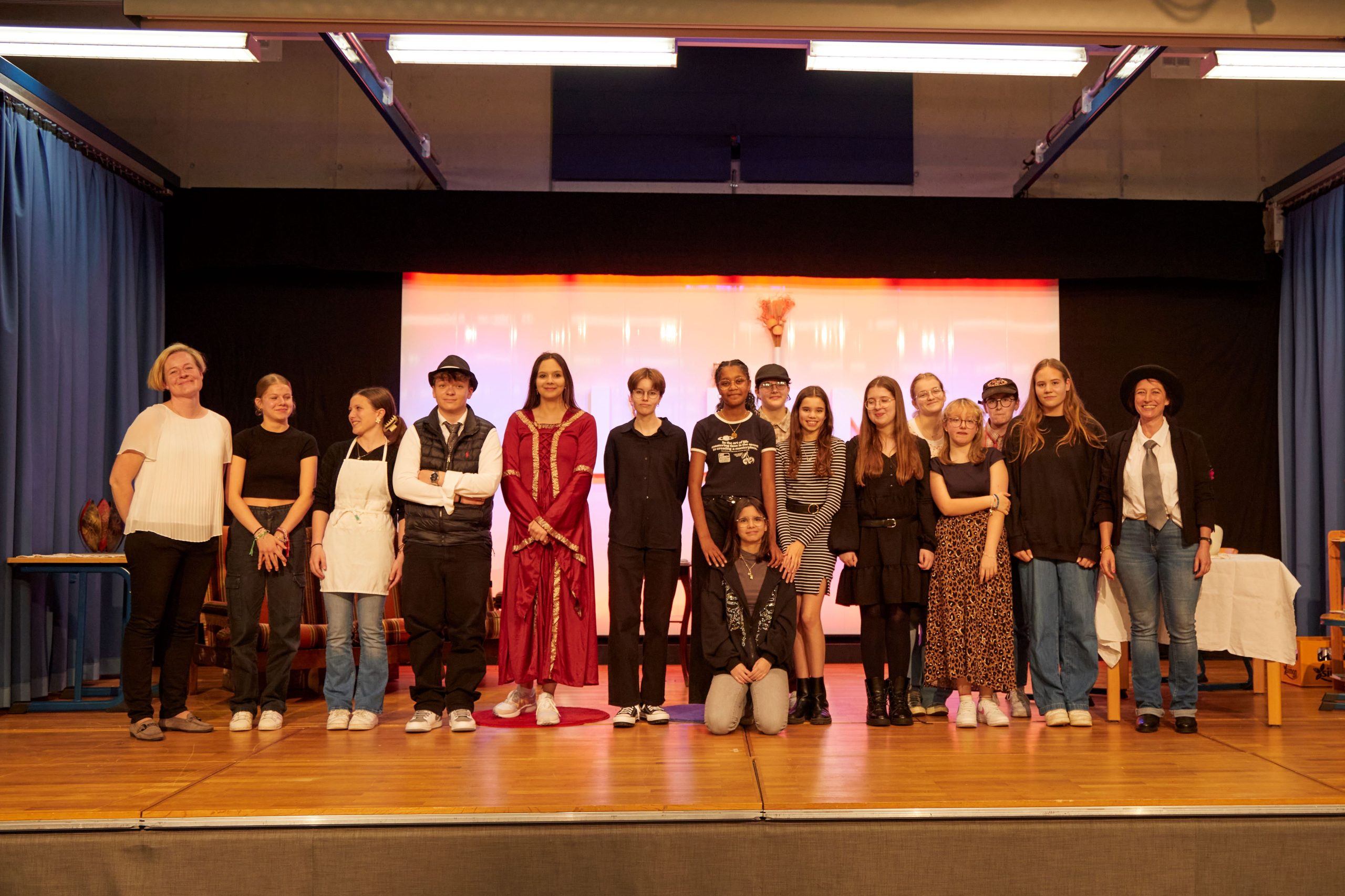Den 3. Mee konnten d’Schüler vum Theatergrupp, vun der 5C1 a vun der Optioun Theater no e puer Joer Paus rëm sou richteg aus sech rausgoen a si hunn och wierklech alles ginn. Et war sécher net ëmmer einfach, d’Opreegung an de Grëff ze kréien, mee si hunn dat immens gutt gemeeschtert a kënnen houfereg sinn op hir Leeschtung! Exigent Vampiren, streidereg al Koppelen, verzweifelt Proffen, duerchdriwwe Kanner, e Mafia-Bopi, eng geckeg Bomi… Et war jiddefalls e lëschtegen Owend mat engem ganz schéine musikaleschen Encadrement vum Här Bonifas an dem Här Blanc.