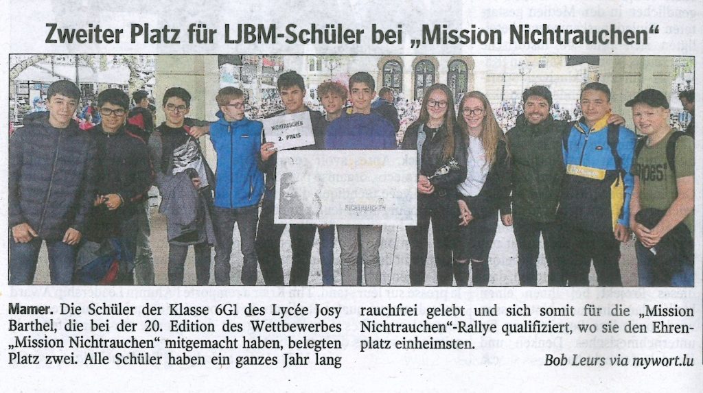 Herzlichen Glückwunsch an die Schüler der Klasse 6G1, die bei der 20. Edition des Mission Nichtrauchen Wettbewerbs 2019 mitgemacht haben. Alle Schüler haben ein ganzes Jahr lang rauchfrei gelebt und sich somit zur Mission Nichtrauchen Rallye qualifiziert, bei der sie den wohlverdienten zweiten Preis ergattert haben.