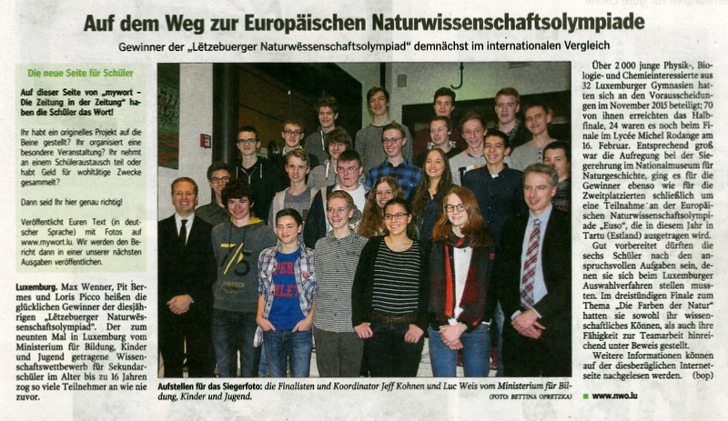 D’Finale fënnt de 16. Februar 2016 am LMRL statt, woubäi déi bescht zwou Equippen dëst Joer op Tartu an Estland fueren, fir sech do mat Jugendlechen aus 34 aner Europäesche Länner ze moossen. Weider Informatiounen ënnert www.nwo.lu