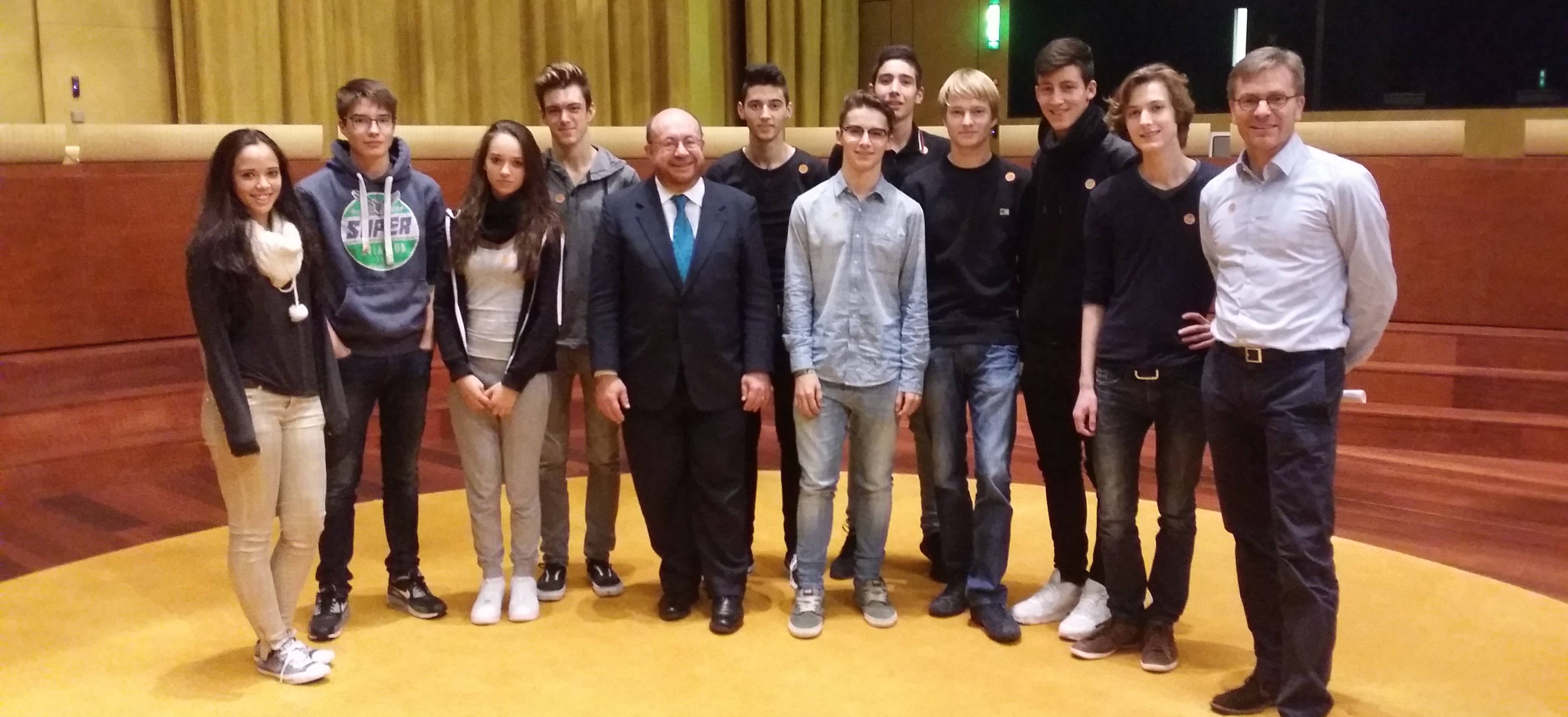 Publié le 11/06/2015De 14. November ware verschidde Schüler vun der 11TG an der 2G, zesumme mat Schüler aus der Europaschoul II, um Europäesche Geriichtshaff um Kierchbierg op Besuch. Des Visite war am Kader vun engem gemeinsame Projet zum 25. Joresdag vum Fall vun der Berliner Mauer. D’Schüler, begleedt vun hirem Geschichtsproff Guido Lessung, hunn dobäi Bekanntschaft gemaach mat dräi europäesche Richteren, déi hir perséinlech Erliefnisser an de Kontext vun de kommunistischen Diktaturen an dem Zesummebroch vum Kommunismus gesat hunn: den Här Jiří Malenovský (Tschechien), den Här Jean-Claude Bonichot (Frankräich) an den Här François Biltgen (Lëtzebuerg).