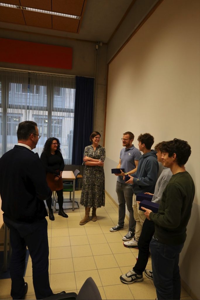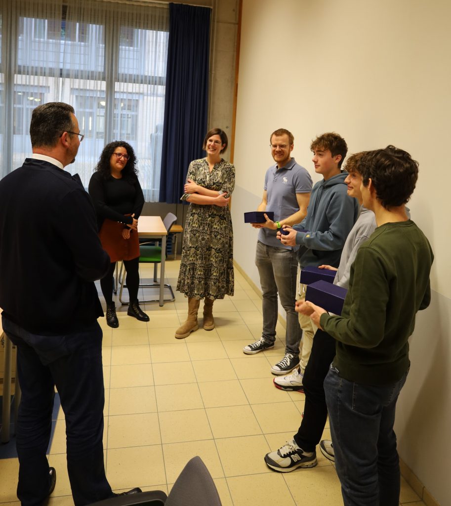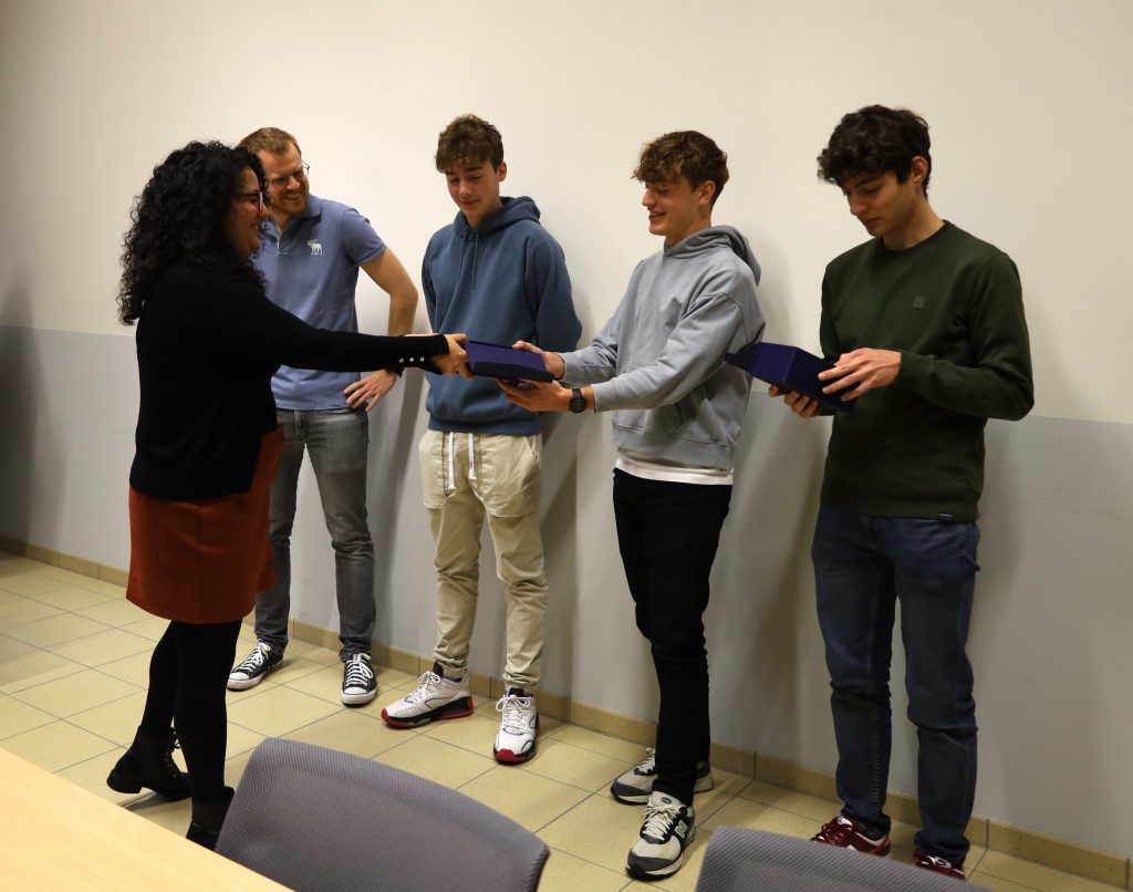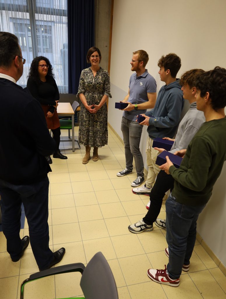 En Donneschdeg, de 16.11., waren d’Madamm Ribeiro an d’Madamm Controguerra vum STATEC bei eis an d’Schoul komm, fir eise Schüler hire Präis z’iwwerreechen. Den Nathan, den Damien an de Misael haten als Ekipp _ALGEBROS_ am Kader vun der European Statistics Competition eng fantastesch 2. Plaz erreecht. Mir gratuléieren nach eemol nodréiglech eisen 3 Schüler fir hir super Leeschtung. E Merci geet och un den Här Heymans fir d’Ënnerstëtzung.