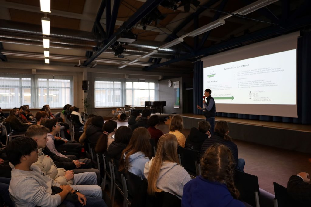 De 24.11. hu sech d’Schüler vun de Klasse 5G1S, 4GIG, 4G3S, 4GA3D1, 4GA3D2, 3GIG, 3GA3D, 3CB, 3CC an 2CC am Festsall vum Lycée Josy Barthel versammelt a krute vum Dr. Guillaume Trap, Koordinator vun der Fondation Jeunes Scientifiques Luxembourg (FJSL), e flotte Virtrag presentéiert. Den Här Trap huet gewisen, wéi ee schonns als Schüler de Gout fir d’Wëssenschaften iwwert wëssenschaftleche Phenomeener an Experimenter kréie kann a wéi dann den Intressi fir e wëssenschaftlecht Studium an e spéidere Beruff am Beräich vun den Natur- an Ingenieurswëssenschaften entstoe kann.