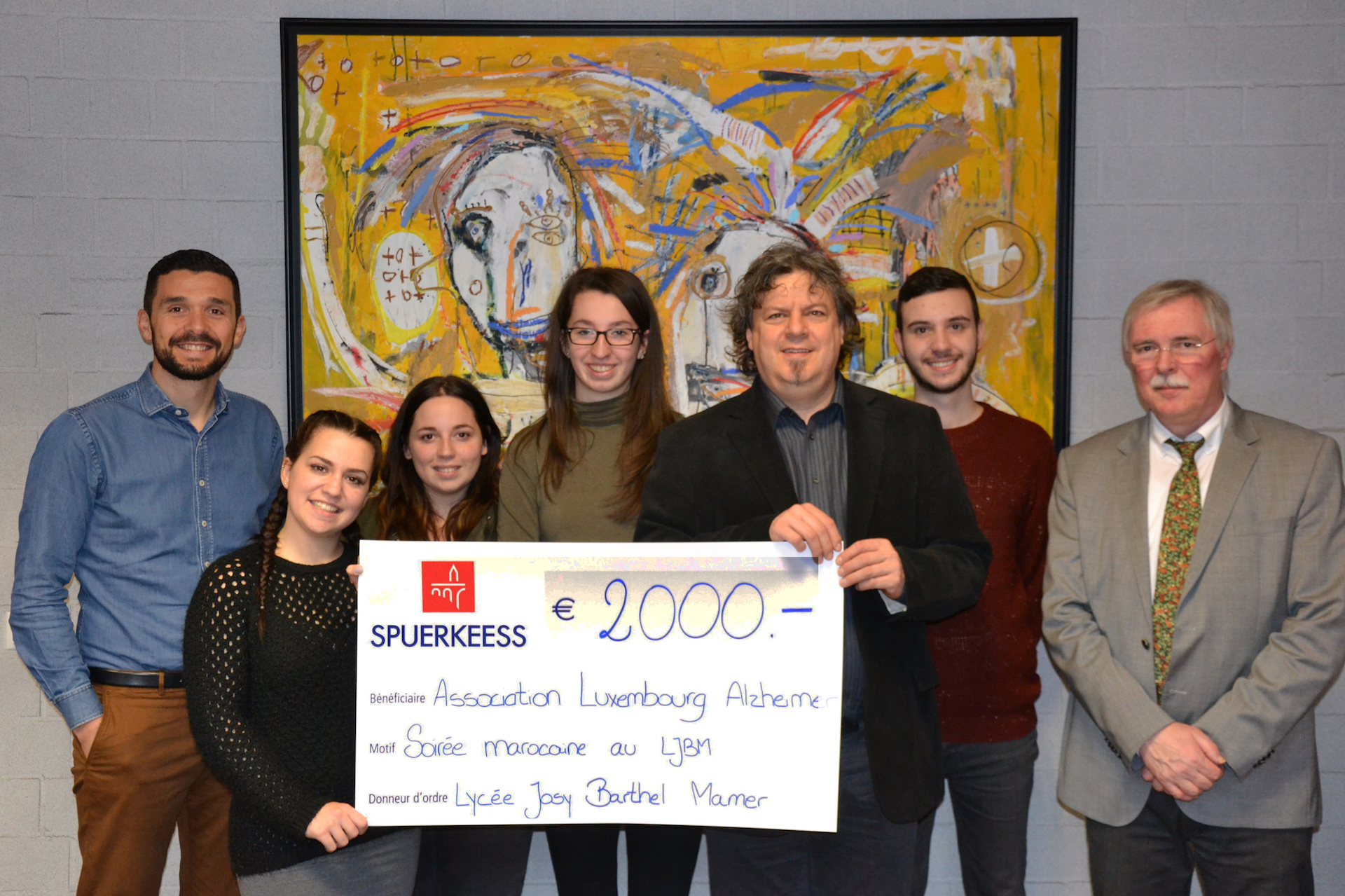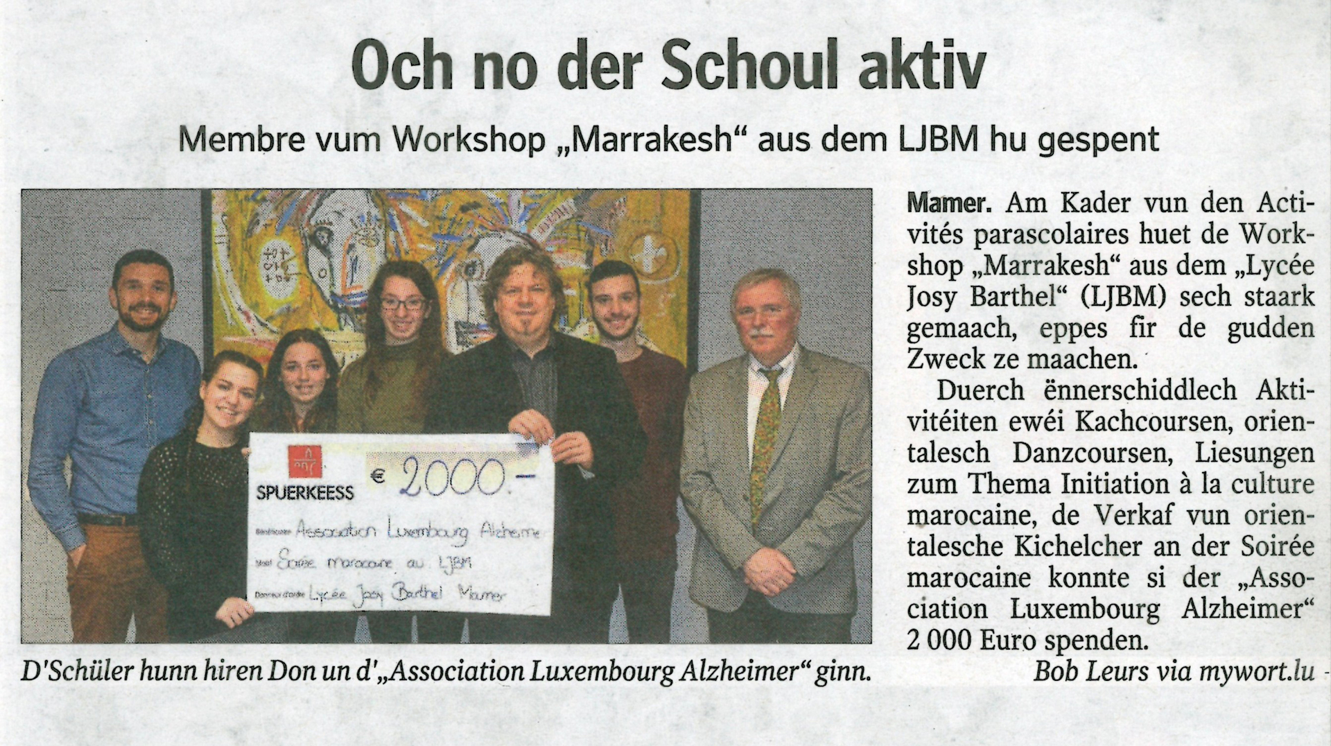 Publié le 02/07/2017Am Kader vun den Activités parascolaires huet de Workshop Marrakesh sech stark gemaach, eppes fir de gudden Zweck ze maachen. Duerch ënnerschiddlech Aktivitéiten ewéi Kachcoursen, orientalesch Danzcoursen, Liesungen zum Thema Initiation à la culture marocaine, de Verkaf vun orientalesche Kichelcher an der Soirée marocaine spenden si der Association Luxembourg Alzheimer 2.000 €. Ee grousse Merci geet un all déi, déi gehollef hunn, dëst méiglech ze maachen. Roland HERRMANN – 01/2017