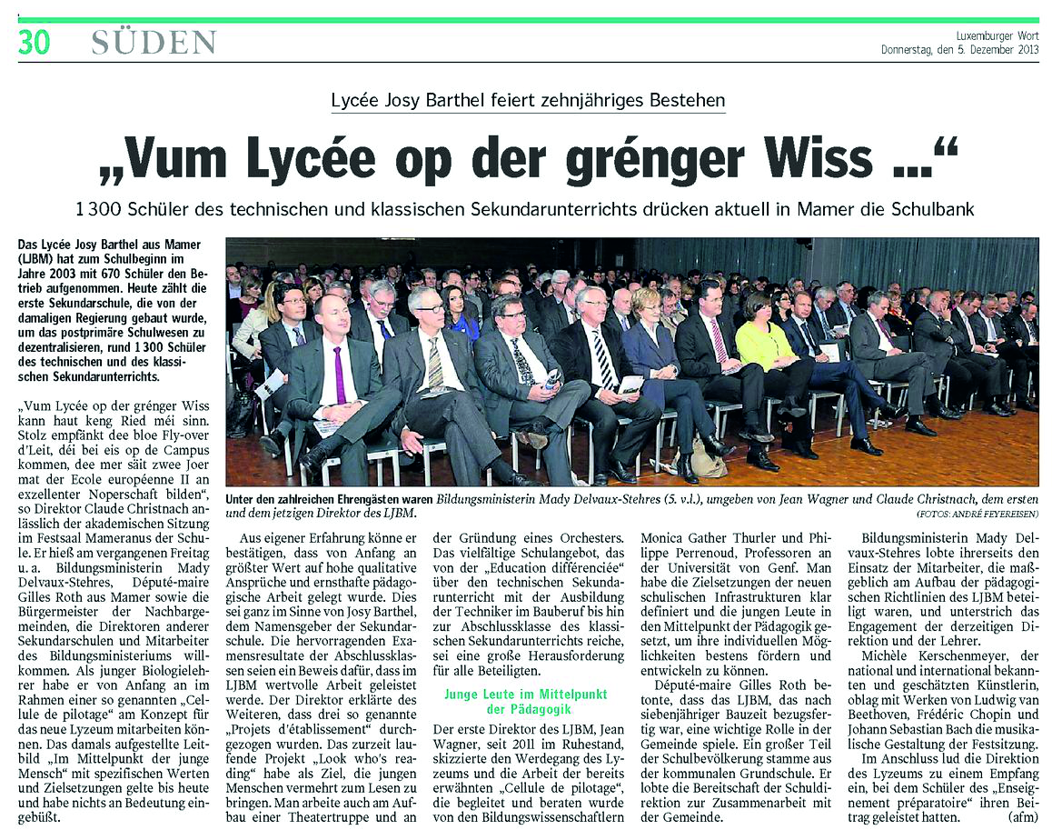 Publié le 11/05/2014Mat enger Séance académique, ënner Präsenz vu villen Autoritéiten, hunn d’Feierlechkeete vum 10. Gebuertsdag vun eiser Schoul de leschte Freideg, 29. November, offiziell ugefaangen. Den Direkter Claude Christnach huet a senger Eröffnungsried iwwert d’Schoul geschwat, wou se haut steet, während de fréieren Direkter Jean Wagner en intressante Réckbléck op d’Ufäng vum Lycée gemaach huet. Ausserdeem hunn d’Edukatiounsministesch Mady Delvaux an de Mamer Buergemeeschter Gilles Roth e puer Wuert un d’Inviteeë geriicht. Musikalesch cadréiert gouf d’Feier vun der bekanntener, vu Mamer gebierteger Pianistin Michèle Kerschenmeyer. No der Feier gouf de Gebuertsdagskuch opgeschnidden. Klickt op de Kuch, fir weider Fotoen ze gesinn!