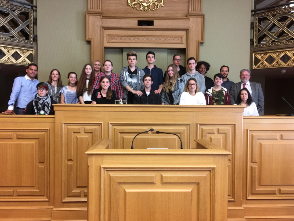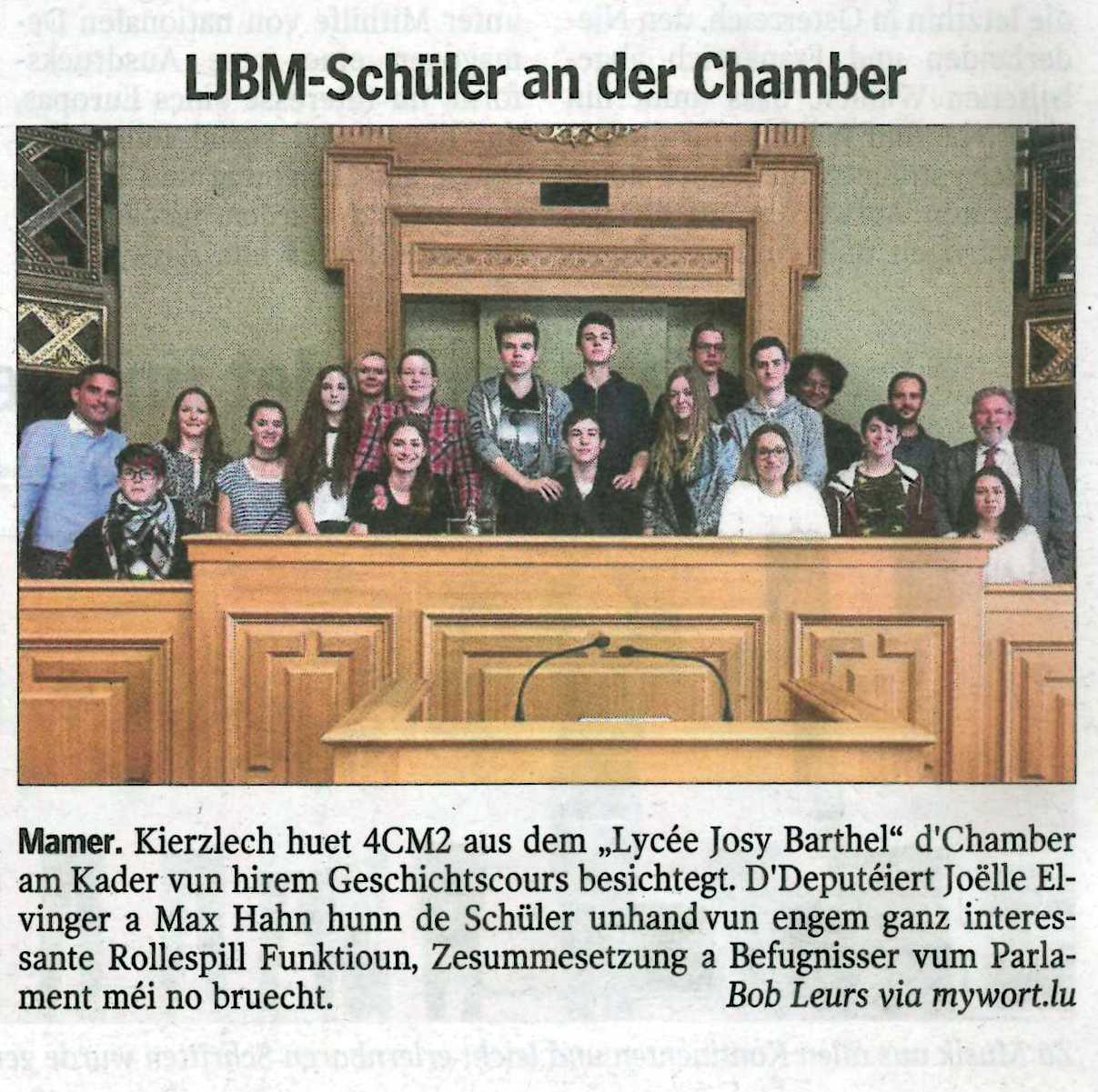 Publié le 02/07/2017Den 12. Mee war d’4CM2 d’Chamber am Kader vun hirem Geschichtscours besichtegen. D’Deputéiert Joëlle Elvinger a Max Hahn hunn de Schüler anhand vun engem ganz interessante Rollespill Fonctioun, Zesummesetzung a Befugnisser vun eisem Parlament méi no bruecht. Jessica WILMES – 05/2017 – LW du 09/05/2017